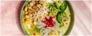 Tijd om je soep samen te stellen: begin met de rijstnoedels, schep de romige broccoli-soep eroverheen en leg de goudbruine tofu er bovenop.